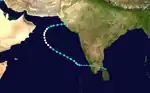 Another tropical depression formed in the Bay of Bengal on October 25 and moved northwestward.[1] The depression became a cyclonic storm the following day[3] The storm then turned to the northeast and then back to the northwest[1] were its winds peaked at 45 mph (70 km/h) before dissipating off the coast of Bangladesh on October 28.[3]