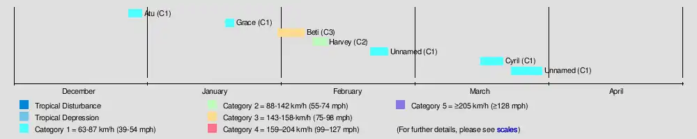 UnnamedMarch 23–30Category 1 tropical cyclone75 km/h (45 mph)990 hPa (29.23 inHg)