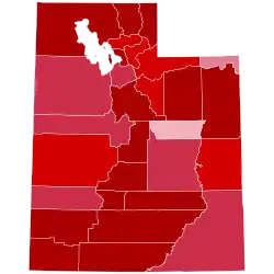 The presidential election of 1984 was a very partisan election for Utah, with just under 99% of the electorate voting for either the Democratic or Republican parties,[1] though several other parties appeared on the ballot. Reagan posted the highest vote share of any nominee in the state since William Jennings Bryan in 1896, and carried every county in the state. Reagan's best county was Box Elder County, although he broke 80% in 15 counties. Mondale's best county was Carbon County, the only one in which he managed to hold Reagan to a plurality, rather than a majority, win. Mondale did make gains vis-à-vis Jimmy Carter of over ten percent in eastern Daggett County and San Juan County, probably related to a general trend in this election of Native American voters towards Mondale.[2] The highly populated Salt Lake County contributed about half of the Democratic votes produced by Utah, but still was won decisively by Reagan by 40 points, in what was, overall, a very solid statewide victory.