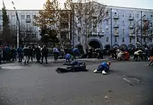On 2 September, the situation becomes violent when demonstrations organized by the People's Front of Georgia and the NDP to ask for Jaba Ioseliani's freedom are attacked by MIA forces.[25] According to the non-government organization Human Rights Watch, the protesters, assembled on Rustaveli Avenue, are beaten with batons, while soldiers shoot at the crowd, injuring three civilians.[25]