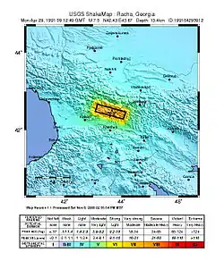 The 1991 Racha earthquake occurred in the province of Racha, Georgia, at 9:12 UTC on 29 April. Centered on the districts of Oni and Ambrolauri on the southern foothills of the Greater Caucasus mountains, it killed 270, left approximately 100,000 homeless and caused severe damage, including to several medieval monuments.[4] It had a magnitude of 7.0 and was the most powerful earthquake recorded in the Caucasus.[5]
