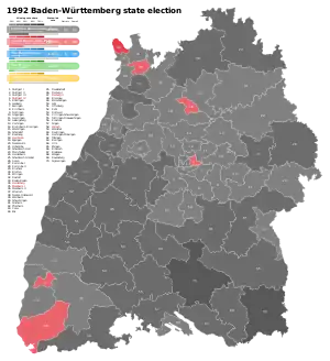 The 1992 Baden-Württemberg state election was held on 5 April 1992 to elect the members of the 10th Landtag of Baden-Württemberg. The incumbent Christian Democratic Union (CDU) government under Minister-President Erwin Teufel lost its majority. The CDU suffered a 9.4% swing, mostly to the national conservative Republicans, who achieved their best result in a state election, placing third with 10.9%. After the election, the CDU formed a grand coalition with the Social Democratic Party (SPD), and Teufel was re-elected as Minister-President.