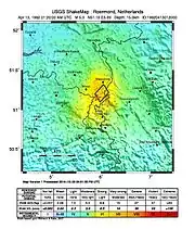 The 1992 Roermond earthquake occurred on 13 April, around 3:20 AM (1:20 UTC) with a moment magnitude of 5.3 and a maximum Mercalli intensity of VIII (Severe).[2] Striking on the Peel Boundary Fault, a normal fault near Roermond, it was the strongest recorded earthquake in the Netherlands and in Northwestern Europe, and caused substantial damage to older buildings in the Netherlands and adjacent countries of Belgium and Germany. A series of aftershocks followed.