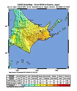The 1993 Kushiro–Oki earthquake (釧路沖地震, Kushiro-Oki Jishin) was one of two large earthquake to strike the Japanese island of Hōkkaido within the same year. The earthquake with a magnitude of 7.6 Mwor 7.8 MJMAstruck at 11:06 UTC or 08:06 pm JST on January 15 near the town of Ashoro. Shaking reached a maximum intensity of IX (Violent) on the Mercalli intensity scale, causing considerable damage, and was felt throughout the island, into northern Honshu, Sakhalin, and the Kuril Islands. As a result of the tremors, two people were killed and more than 600 were wounded.[5]