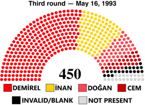 The 1993 Turkish presidential election refers to the election to choose the country's ninth president, to succeed Turgut Özal who had recently died. The candidate of DYP was Süleyman Demirel who was also supported by SHP. In the first and second rounds, the ruling party DYP was unsuccessful in electing its candidate, Süleyman Demirel. Finally, in the third round, Süleyman Demirel was elected as the ninth President of Turkey.[1]