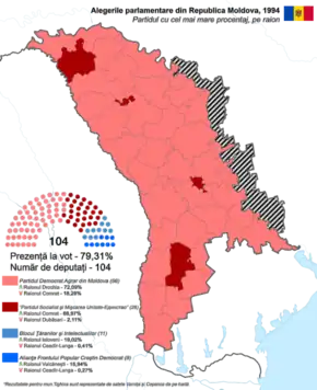 Early parliamentary elections were held in Moldova on 27 February 1994.[1] They were the country's first competitive elections, and followed deadlock in Parliament over the issue of joining the Commonwealth of Independent States.[2] The result was a victory for the Democratic Agrarian Party of Moldova (PDAM), which won 56 of the 104 seats.[3]