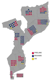 General elections were held in Mozambique between 27 and 29 October 1994 to elect a president and the Assembly of the Republic. It was the first time the country had had multi-party elections, as previously FRELIMO had been the sole legal party. Nevertheless, FRELIMO maintained control of the country's political system, winning both elections. Voter turnout for the elections was 88%.[1]