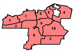 City council was reduced from 15 to 10 seats (excluding the mayor), so elections were fought on a new map. Ward names were not adopted until 1995.