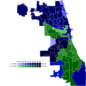 Daley won a majority of the vote in 31 of the city's 50 wards.[25] Burris won a majority of the vote in the remaining 19 wards.[25] In response to Wardingley's abysmal showing, the Republican-controlled Illinois General Assembly passed legislation creating a nonpartisan, runoff election system for citywide offices in Chicago. Public Act 89-0095 was signed into law by Governor Jim Edgar and went into effect for the 1999 Chicago mayoral election.[26][27]