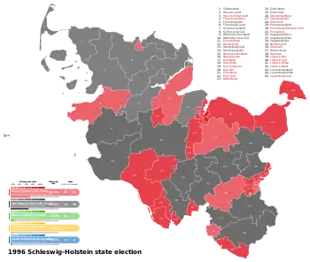 The 1996 Schleswig-Holstein state election was held on 24 March 1996 to elect the members of the Landtag of Schleswig-Holstein. The incumbent Social Democratic Party (SPD) government led by Minister-President Heide Simonis lost its majority. The SPD subsequently formed a coalition with The Greens, and Simonis continued in office.