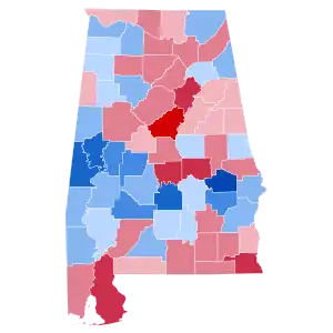 President Clinton became the first Democrat to carry Montgomery County since Adlai Stevenson II in 1952.[2] As well as the first to win two terms without ever carrying the state. As of the 2020 presidential election, this is the last time a Democrat has carried any of the following counties: Butler, Chambers, Cherokee, Clarke, Coosa, Crenshaw, Etowah, Fayette, Franklin, Marion, Pickens, Walker and Washington.[3]