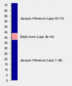 The 72-lap race was won from pole position by Jacques Villeneuve, driving a Williams-Renault. Eddie Irvine finished second in a Ferrari, while Ralf Schumacher, in only his third F1 race, finished third in a Jordan-Peugeot.