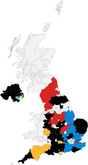 All 34 non-metropolitan counties, 21 out of 46 unitary authorities, 1 out of 238 English districts, 1 sui generis authority and all 26 Northern Irish districts | |||||||||||||||||||||||||