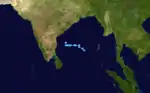 The IMD began monitoring an area of low pressure over the Laccadive Islands on October 10. The low traveled towards the northwest with little development.[7] On October 15, the JTWC issued a TCFA as the system became better organized. Although wind shear increased, the first advisory was issued the next day. With minimal convection, the storm never intensified past 65 km/h (40 mph).[9] The system traveled towards the northeast and weakened due to strong wind shear. On October 17, the storm fell below tropical storm status and made landfall on the Kathiawar Peninsula, near the same area where 03A made landfall in early June.[7] The storm dissipated shortly after landfall.[7][9]