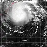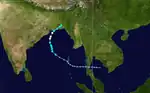On November 10, an area of low pressure developed over the Bay of Bengal within a monsoonal trough. Moving towards the northwest,[44] the low gradually developed and the JTWC issued a TCFA early on November 13. The next day, the first advisory on Tropical Cyclone 06B was issued.[10] A brief period of rapid development took place as the storm strengthened just below Category 1 status. Shortly before making landfall near Visakhapatnam,[44] 06B reached its peak intensity with winds of 155 km/h (96 mph).[10] At this time, the IMD classified the cyclone as a Very Severe Cyclonic Storm and reported that it had a 60 km (37 mi) wide eye.[45] Rapid weakening followed shortly after landfall and the storm dissipated early on November 16.[10][44]