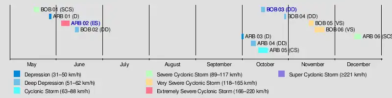 The first storm of the season developed on May 18 out of an area of low pressure over the Bay of Bengal. It reached its peak intensity with winds of 130 km/h (81 mph) before making landfall near Chittagong, Bangladesh. The storm dissipated shortly after.[4] Later that month, a short-lived storm developed over the Arabian Sea and dissipated the next day without impacting land.[5] The most intense storm of the season formed in early June off the southwestern coast of India. It slowly traveled towards the west, remaining relatively weak before turning towards the north and intensifying. The storm reached its peak intensity with winds of 195 km/h (121 mph) shortly before making landfall near Porbandar in the Indian state of Gujarat. The cyclone rapidly dissipated on the same day.[6]