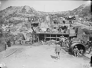 Meanwhile, D Company landed at Anzac Cove on the Gallipoli peninsula on 19 September, with a strength of five officers and 212 other ranks, and pitched tents. The detachment's duties mainly covered water supply, ammunition carrying, burial parties, guarding PoWs, and operating the light railway. The company suffered a number of casualties from shellfire and small arms fire, the first fatality from enemy action occurring when a party carrying rations to the front line was hit by Shrapnel shell. In October Capt Sir Capel Wolseley led a party of reinforcements from the battalion on Lemnos and took command of the detachment. In November the detachment headquarters camp came under long-range machine gun fire and after suffering a number of killed and wounded moved into dugouts. On 23 October a further party of 74 NCOs and ORs from Lemnos landed at Cape Helles on the peninsula to carry out similar beach duties.[1]