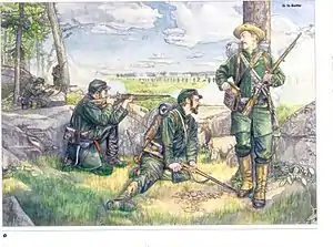 The battalion was formed by early August, and on the 21st marched from Camp Pemberton to Camp Anderson, named for the battalion's commander, located on Wildhorn Plantation, about 12 miles from Savannah.[2] Assigned to guarding strategic Fort McAllister in 1861,[3] they helped repulse seven US Naval engagements to capture Fort McAllister, which protected Savannah. By lining the riverbank with sharpshooters, the defenders rained projectiles on the Union ironclads, forcing them to withdraw, and winning the praise of Confederate generals and congressmen alike. Anderson was promoted to command the 5th Georgia Cavalry, with Major Arthur Shaaf given formal command of the battalion in April 1863. On 5 May, they were ordered to Mississippi as part of General William H. T. Walker's brigade. The brigade moved to join the army being formed under General Joseph E. Johnston for the Battle of Vicksburg.