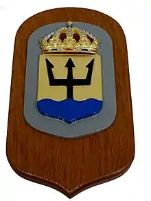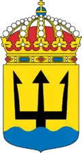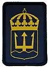 The coat of arms of the 1st Submarine Division (Första ubåtsavdelningen) 1994–1998 and the 1st Submarine Flotilla since 1998. Blazon: "Or, from a wavy base azure a trident issuant sable".[7]