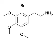 2-Bromomescaline (2-Br-M) is a derivative of the phenethylamine hallucinogen mescaline which has an unusual 2-bromo substitution.[1][2] It is an agonist for serotonin receptors, with a binding affinity of 215 nM at 5-HT1A, 513 nM at 5-HT2A and 379 nM at 5-HT2C, so while it is around ten times more tightly binding than mescaline at 5-HT1A and 5-HT2A receptors, it is over twenty times more potent at 5-HT2C.[3]