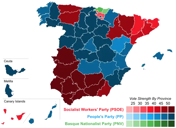 Spanish Socialist Workers' Party (PSOE) 6,741,11243.46+8.13 25+1