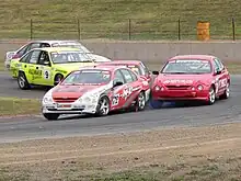 Clint Harvey (# 71 Ford AU Falcon) leads Paul Fiore (#30 Holden VN Commodore), Scott Nicholas (#7 Ford AU Falcon) and Peter Holmes (#9 Holden VN Commodore) at the Mallala Motor Sport Park round of the championship.