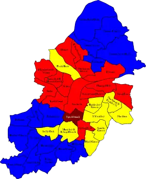 ![]() Map of the 2006 Birmingham City Council election results. Labour in red, Conservatives in blue, Liberal Democrats in yellow and Respect in burgundy. | |||||||||||||||||||||||||||||||||||||||||||||||||||||||||||||||||||||