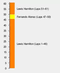 The race restarted on lap 26, with Vettel now pressurising Hamilton for the lead. Rosberg served his penalty on lap 28, demoting him to 14th position. Hamilton and Vettel traded fastest laps with the gap between them hovering under a second. Behind Vettel the longer-fuelled Timo Glock was being encouraged to keep pushing as his team believed they could leap-frog the Red Bull in the pits.[14]