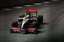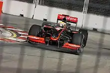 The 2009 Singapore Grand Prix (formally the 2009 Formula 1 SingTel Singapore Grand Prix) was a Formula One motor race held at the Marina Bay Street Circuit in Singapore on 27 September 2009. The 61-lap race was the fourteenth round of the 2009 Formula One season. It was the second Singapore Grand Prix to be part of a Formula One Championship and the tenth Singapore Grand Prix overall. It was also the second Formula One race to be held at night. The race was won by McLaren-Mercedes driver and reigning World Champion Lewis Hamilton. Toyota's Timo Glock finished second and 2008 race winner Fernando Alonso took third position, making this the only race of the season with neither a Brawn nor a Red Bull driver on the podium. This was also the last race of 2009 for Glock, as he was injured during qualifying for the Japanese Grand Prix and was replaced by test driver Kamui Kobayashi. Heikki Kovalainen scored his last World Championship points at this race, as did second-placed Glock.