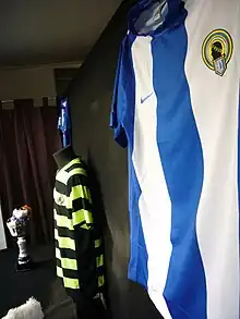 The team kits for the 2010–11 season are produced by Nike, first in its history.[6] For the first time since 1983, the Hércules will not have sponsor on their shirts.[6] Only in a friendly match against Real Madrid, the Hércules wore the sponsor Cívica.[7] On 29 July 2010, the new shirts were officially presented.[6] The first kit, maintains its traditional colors of blue and white vertical stripes with historic characterized by its thickness.[8] The black color of his pants is the same as in its 88-year history.[8] The socks are blue with some white details.[8] New for this season, is the second kit, which for the first time in his life, will have horizontal stripes on his shirt.[8] Pants and socks are still black for the second kit.[8] The socks and pants will be white, so that these items are not confused with those of a rival team.[8]