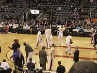 The 2010–11 Raptors warming up prior to a home game against the Cleveland Cavaliers at the Air Canada Centre