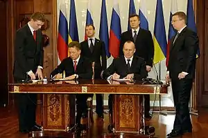 Signing of the deal reached at the Kharkiv summit at 21 April 2010 by Alexei Miller and Yevhen Bakulin (with Dimitry Medvedev and Viktor Yanukovych standing in the background)