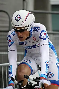Pinot continued his good form in August's Tour de l'Ain, winning two stages including the final stage summit finish to Le Grand Colombier,[88] and also held the overall lead after his stage 2 victory.[89] At the Tour du Limousin, after a seventh place and a second place in the opening two stages, Ladagnous won stage three by out-sprinting Cofidis rider Samuel Dumoulin to the line, enabling him to move into third place in the general classification.[90] Ladagnous repeated his victory the next day, to take second place overall, behind Vacansoleil–DCM's Björn Leukemans.[91] The squad took two minor classification victories at the race, with Roux winning the sprints classification and Geslin winning the mountains classification.[91] Later in August, at the Tour du Poitou-Charentes, the squad took their fifth stage victory of the month as Hutarovich earned another victory in a sprint finish, by taking the spoils in the second stage,[92] and later took the overall lead after a second-place finish in the following morning's third stage.[93] Hutarovich lost almost four minutes in the afternoon time trial, but a fifth-place finish in the final stage secured Hutarovich in the points classification.[94] Pinot scored his fourth stage win of the year by soloing to victory in the opening stage of the Settimana Ciclistica Lombarda.[95] Pinot maintained his overall lead to the end of the race, and also won the young rider classification, as he did in the Alsace.[96]
