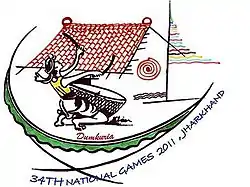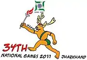 The mascot of the games is Chhaua, a deer in running motion holding the torch. Chhaua depicts the body of a human and head of a stag, symbolising both stillness and energy that characterise Jharkhand's tribal communities.[6] Chhaua means "little boy" in the local language.[7] The mascot of the games, Chhaua in famous dokra-art will be presented to all the players and officials by the games committee. The National Games Organising Committee (NGOC) had issued orders for the same to Jharcraft for manufacturing 14,000 mementoes that will be given to players and guests as a remembrance of their arrival in the State.[8] During the opening ceremony of the games, the Games mascot 'Chhaua' – baby deer—made an aerial entry into the athletics complex and ran around the stadium with the torch with echoes of Vande Mataram.[9]