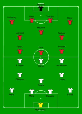 The 2011 Trophée des champions (English: 2011 Champions Trophy) was the 16th edition of the French super cup. The match was to be contested by the winners of Ligue 1 the previous season, Lille, and the defending Coupe de France champions. However, due to Lille also winning the Coupe de France the previous season, the club faced the runners-up of the previous league campaign Marseille.[2] The match was played, for the third consecutive season, on international soil at the Stade de Tanger in Tanger, Morocco.[2] Like the previous two seasons, the idea was to promote French football abroad, but this time more specifically in Africa and the Arab world. The match was televised live on Canal+ in France and throughout 77 countries in the world, a new record for country viewership.[3] On 21 July 2011, it was confirmed by the Ligue de Football Professionnel that Bouchaïb El Ahrach would officiate the match.[4] Marseille trailed Lille by 3–1 with five minutes to go but came back to win 5–4.[5][6]