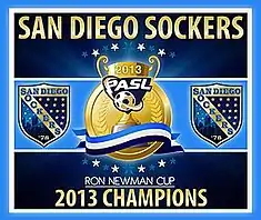 San Diego also performed well at the box office, placing second in the league (behind only Dallas) in overage home attendance.[1] The team advanced to the postseason and earned the right to play for the Ron Newman Cup in the PASL National Championship. The Sockers defeated the Turlock Express in two straight games, winning the Pacific Divisional Finals and advancing to the Semi-Finals in San Diego where they defeated the Las Vegas Legends in overtime.[13][14] The team defeated the Detroit Waza 8–6 in regulation for the league championship on March 11, 2013.
