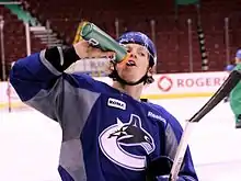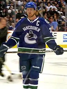 In his first game as a Canuck, Roy tallied an assist helping Vancouver to a 4–0 win. The win moved the Canucks passed Minnesota for the division lead.[108] The shutout marked Schneider's fourth of the season, which doubled his career total.[109] Two games later, Schneider registered his fifth shutout of the season in a 2–0 over the Coyotes, tying him for the League lead. The game also marked the return of Kesler, who scored the game-winning goal.[110] Minnesota slumped towards the end of the season and the Canucks won their fifth-straight Northwest Division title with a 2–1 victory over the Blackhawks.[111] In the game, Schneider suffered a groin injury and was unable to play the last two games of the season; he was listed by the Canucks as day-to-day with a "body" injury.[112][113][114] With Schneider out, the Canucks lost their final two regular season games. In their final loss, Vigneault rested many of his regulars, though he received criticism for playing Henrik Sedin for only 22 seconds. Furthermore, Sedin left the bench after his one shift. The Los Angeles Times' Helene Elliott called it a cheap way of keeping Sedin's ironman streak intact. For his part, Henrik Sedin told Vigneault that "he would be okay with sitting out the game" and to him the streak is just "a number in the paper." Vigneault responded by telling Sedin that "he's not going to be the one that breaks the streak," and he gave him the choice to remain on the bench or return to the locker room. Sedin felt remaining on the bench would have been a further distraction and chose to leave.[115][116] By season's end, the Sedin twins' point production dropped from the previous years. Henrik's point points-per-game average was the lowest it had been since 2007–08, while Daniel's was his worst since 2003–04.[117][118] The Cauncks' power play also struggled throughout the year dropping from fourth in 2011–12 to 23rd in the League.[119][120]