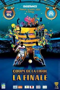 The 2012 Coupe de la Ligue final was the 18th final of France's football league cup competition, the Coupe de la Ligue, a football competition for the 42 teams that the Ligue de Football Professionnel (LFP) manages. The final took place on 14 April 2012 at the Stade de France in Saint-Denis and was contested between Lyon and Marseille.[2][3] The latter club entered the match as the two-time defending champions of the competition and sought to become the first club in French football history to win the competition three consecutive years after previously becoming the first club to win the competition in back-to-back seasons.[3] Lyon made its first finals appearance since the 2008 Coupe de France Final and played at the Stade de France for the first time in nearly three years. The final was broadcast live on public network broadcaster France Télévisions.[4]
