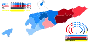 According to the preliminary final results, the CNRT is in the lead with 36.66% (30 seats), followed by Fretilin with 29.87% (25 seats). The PD obtained 10.31% (8 seats) and the Frenti-Mudança 3.11% (2 seats). The turnout was 74.78%. The other parties and alliances failed to clear the three-percent hurdle, including KHUNTO with a narrow 2.97%.[55][56] The official final result was published by the CNE on 13 July. It confirmed the previously assumed distribution of seats.[57]