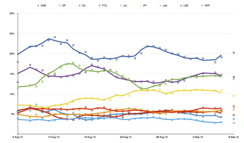 - ↑ "DAB fares best taking 13 seats thanks vote splitting tactic". South China Morning Post. 11 September 2012. Retrieved 21 September 2012.