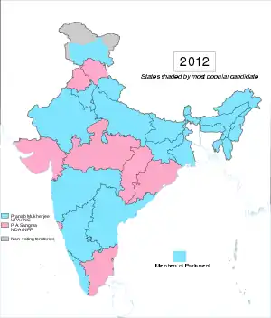 The 14th indirect presidential election, in order to elect the 13th President, was held in India on 19 July 2012. The last date for filing nominations was 30 June, whereas the votes would be counted on 22 July.[1][2][3][4] The two leading candidates for the presidency were former Finance Minister Pranab Mukherjee from West Bengal and former Speaker of the Lok Sabha Purno Agitok Sangma from Meghalaya.