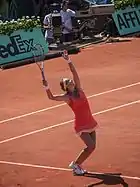 Sara Errani is having a breakthrough season. She reached her first Grand Slam quarterfinals at the Australian Open, losing to Petra Kvitová, 4–6, 4–6.[59] She then won her first title of the year at the Abierto Mexicano Telcel, defeating Flavia Pennetta, 5–7, 7–6(7–2), 6–0.[60] She then claimed the Barcelona Ladies Open over Dominika Cibulková, 6–2, 6–2.[61] At the Budapest Grand Prix, the Italian claimed her third title of the year over Elena Vesnina, 7–5, 6–4.[62] At the French Open, Errani made a surprising run, reaching the final and earning her first top-10 wins over no. 10 Angelique Kerber, 6–3, 7–6,(7–2) and no. 6 Samantha Stosur, 7–5, 1–6, 6–3, before losing to Maria Sharapova, 3–6, 2–6, in the final. The result broke her into the top 10.[23][49][63] At Wimbledon, Errani was on the receiving end of the first golden set in a Grand Slam, when she lost to Yaroslava Shvedova, 0–6, 4–6, in the third round.[64] However, she bounced back by winning her fourth title at the Internazionali Femminili di Palermo over Barbora Záhlavová-Strýcová 6–1, 6–3.[65] At the US Open, she reached her second Grand Slam semifinal, where she lost to Serena Williams, 1–6, 2–6.[66]