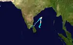 On November 8, the remnants of Tropical Depression 30W (Wilma) crossed the Malay Peninsula, and emerged into the eastern Bay of Bengal.[52] During the next several days, the system drifted towards the west while weakening further. On November 12, the system began to reorganize gradually, while continuing to move westwards. On November 13, the system was classified as a depression by the IMD, and given the identifier BOB 05.[53] The depression maintained its intensity despite passing through an environment unfavorable for intensification, and was re-upgraded to tropical cyclone intensity by the JTWC on November 15.[54] Shortly before landfall, the system weakened due to land interaction, and the JTWC issued its final warning.[55] On November 16, BOB 05 made landfall near Nagapattinam, Tamil Nadu, and the system quickly began to weaken. Later on November 16, the IMD issued its final advisory on Depression BOB 05, as the system weakened into a well-marked area of low pressure.[56] Over the next several hours, the remnant low of BOB 05 moved across the central part of Southern India, and the system continued to weaken. During the next several days, BOB 05 moved westwards across the Arabian Sea as a convectionless low. Later, the remnants of BOB 05 redeveloped a small amount of convection, while continuing to moved westwards. Late on November 21, the remnants of BOB 05 turned to the southwest, affecting Socotra Island on November 22. Early on November 23, the remnants of Depression BOB 05 dissipated just south of Socotra Island.