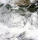 The storm slowly drifted west-northwestward while deep convection consolidated around the system's well-defined center of circulation.[63] In the early hours of November 20, the IMD classified BOB 06 as a Cyclonic Storm, thereby officially naming it Helen.[64] Helen continued to intensify into a Severe Cyclonic Storm the following day, reaching its peak intensity of 100 km/h (62 mph) with a central pressure of 990 mbar (29 inHg). Shortly before landfall, the storm's convection sheared to the north, causing its low level circulation to fully expose followed by the JTWC issuing its final bulletin, reporting that the storm had weakened due to land interaction.[65] Helen made landfall south of Machilipatnam, Andhra Pradesh and rapidly deteriorated into a deep depression.[66][67] It was last noted as a low-pressure area on November 23. A total of 11 deaths were reported in incidents related to the cyclone.[68][69]