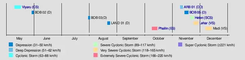 | Phailin | October 8–14 | Extremely Severe Cyclonic Storm | 215 km/h (135 mph) | 940 hPa (27.76 inHg) | Malay Peninsula, Andaman and Nicobar Islands, India, Myanmar, Nepal | $4.26 billion | 45 | |