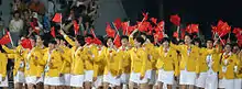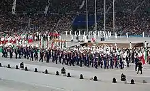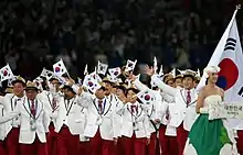 Below is a list of national flagbearers during the ceremony.[24] The nations entered in alphabetic order of their country names in Korean. Whilst most countries entered under their short names, a few entered under more formal or alternative names, mostly due to political disputes. The Republic of China (commonly known as Taiwan) entered with the compromised name and flag of "Chinese Taipei", using an English transliteration of the name (차이니스 타이페이 Chainiseu Taibei) to avoid translation issues.