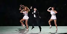 South Korean K-Pop artist group JYJ consists of Kim Jae-joong, Yoochun and Junsu, performing a medley of few of their singles including "Only One", the games' official theme song, "Flame" and their hit "Empty" during the torch relay section.[21] The torch was relayed into the stadium by Lee Seungyeop, 'a Korean baseball hitter'; professional golfer, Park Inbee; speed skater Lee Kyouhyuk; basketball legend Park Chansook; and tennis pioneer, Lee Hyungtaik. South Korean actress, Lee Young Ae the main cast of Dae Jang Geum climb to the top of the stadium to light up the cauldron accompanied by young diving talent Kim Young-ho and young gymnast Kim Joo-won and aerial fireworks were released all over the stadium to mark the start of the games. The ceremony concludes with Psy performing a funky remake of "Champion," one of his early favourites singles, alongside Chinese pianist Lang Lang and global hit song at the time, "Gangnam Style". (Since 24 November 2012, Gangnam Style's music video was the most-viewed YouTube video until it was overtaken by Wiz Khalifa's "See You Again" on 10 July 2017.)[22][23]