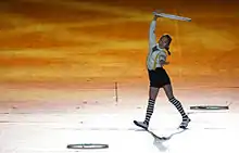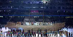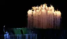 The ceremony started with a few introductory performances. The first one, featuring a little girl named Kim Min rolling a hoop across the main stadium to actor Jang Dong-Gun who in turn gave the hoop back to her,in a act that remembered the 1988 Summer Olympics opening and closing ceremonies,the “Hoop Boy and Girls” performances.[14] Kim is a young rhythmic gymnast attending Incheon Cheongil Primary School who hoped to represent Korea in the 2020 Summer Olympics. She was later joined by 44 other hoop-rolling children from various schools to represent the 45 participating nations of the games as well as the population of the Asian continent of 4.5 billion. In the second one, a few women dancers in traditional costume gathered at the center of the stage to form Cheongsachorong, a traditional Korean lantern to mark the arrival of notable guests including Park Geun-hye, then the President of South Korea. The third performance featured soprano Sumi Jo who sang "The Song of the Asiad," dedicated by poet Ko Un, along with Incheon Metropolitan Citizens Choir, a choir consisting of 919 residents of the host city symbolising the event's opening date. The performance was composed by Kim Youngdong, a representative composer for traditional music of Korea.[15] At the end of the performance, Sumi Jo sang the Korean traditional folk song Arirang with 10-vocalist choir.[16][17] Before the start of the main performance, a video of the 2014 Asian Games torch relay was played with British band Coldplay's single, Viva la Vida as background music.
