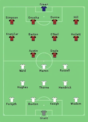 Queens Park Rangers started the second half and in the 51st minute, a Ward pass was put out for a corner by Dunne which was subsequently cleared by Danny Simpson. Two further corners followed but with no end product, as the game remained goalless. In the 57th minute, Doyle passed to Traore whose pull back found Austin who struck the ball wide of the post from 12 yards. It was Doyle's last involvement as he was then replaced by Bobby Zamora in QPR's second substitution of the afternoon. In the 60th minute, O'Neil was shown a red card for fouling Russell as he was about to shoot. Soon after, to bolster the QPR midfield, Clint Hill was replaced by Karl Henry. Derby made their first substitutions of the game, with Bryson on for Hughes and Simon Dawkins replacing Russell. Two minutes later Bryson forced Green to make a low save, then Martin's shot from a Bryson pass needed the QPR goalkeeper to make a reaction save from the corner of the six-yard box. Hendrick drew another save from Green in the 75th minute, the rebound from Ward being blocked by teammate Martin. Another Hendrick shot in the 87th minute went straight to Green and in the last minute of regular time, QPR's Zamora curled a shot past Grant to make the score 1–0. Three minutes of injury were indicated, and in the last of those, Bamford came on for Ward and his attempted overhead kick was deflected behind by Barton. Derby goalkeeper Grant came up for the corner which was kicked out for a throw by Keogh, and a minute later the final whistle was blown, QPR winning the match 1–0.[19]