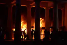 The truce between the two sides from the opposition's ultimatum to the government held, which expired at 8 p.m. Fire from the conflict zone spread and a shop was burned down on the first floor of the seven-story building, 40 square meters in area (at 2 Museum Alley).[64] The fire was caused by the burning rubber tires that blocked the vulytsia Hrushevskoho.[64] The burning tires were set to provide smoke screen for protesters.[64]